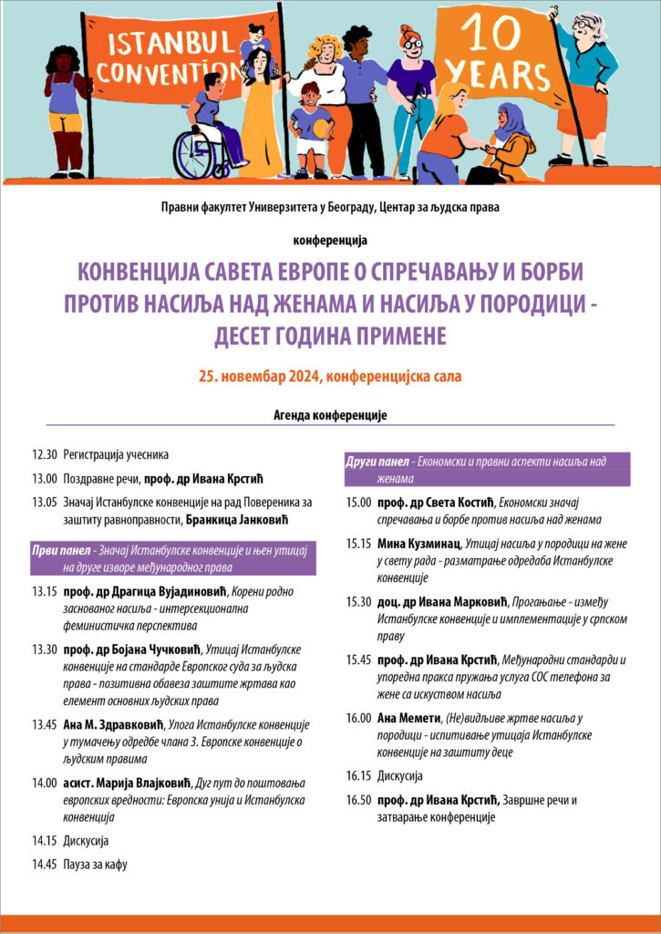 У понедељак, 25. новембра 2024. године, на Правном факултету Универзитета у Београду одржана је конференција поводом обележавања десет година примене Конвенције Савета Европе о спречавању и борби против насиља над женама и насиља у породици.