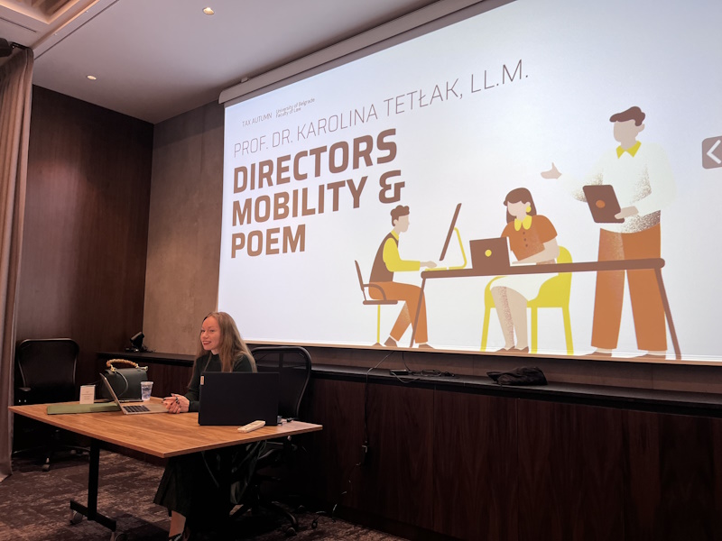 Прве недеље, 16. октобра 2025. године, одржана су два предавања у оквиру Пореске јесени. Предавања је одржала др Каролина Тетлак (Karolina Tetłak), ванредна професорка Универзитета у Варшави, призната стручњакиња у области опорезивања високо мобилних појединаца, међу којима су спортисти, естрадни уметници, дигитални номади, прекогранични радници и руководиоци. Захваљујући њеном богатом искуству и међународној експертизи, обрађене су две изузетно актуелне теме: „Мобилност директора и место стварне управе“ и „Опорезивање јутјубера и инфлуенсера у међународном пореском праву“. У оквиру првог предавања проф. др Тетлак представила је практичне стратегије за директоре и компаније за ублажавање ризика, обезбеђивање правне сигурности и прилагођавање реалности глобалне мобилности и дигиталног управљања. Током другог предавања она је анализирала начин на који међународно пореско право покушава да обухвати савремене пословне моделе карактеристичне за јутјубере, стримере и инфлуенсере.