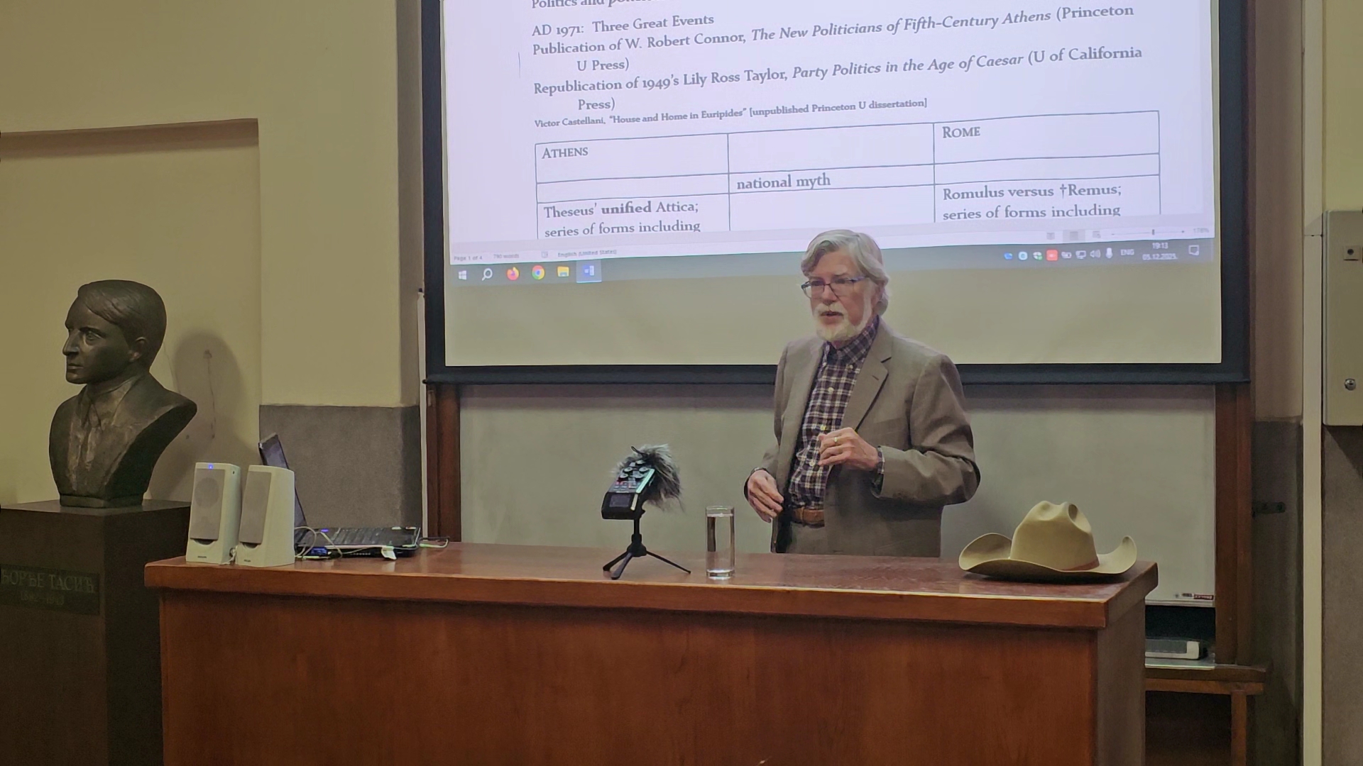 У петак, 5. децембра, у клубу “Forvm Romanvm” наш стари пријатељ, проф. др Виктор Кастелани (Victor Castellani) са Универзитета у Денверу одржао је предавање “Politics versus Constitution and Law? Crises at Athens (5th century BC) and Rome (1st century BC)”. Почевши од појма политике и најважније литературе на тему политике у старој Грчкој и Риму, започео је низ паралела између античке Атине и Рима, од оснивачких митова, преко назива за државу и њене грађане, до политичког уређења. Говорио је о начину избора магистрата и политичких тела, различитим скупштинама и разним начинима гласања, као и ставовима према писаном праву и неписаном ‘уставу’, тј. основама правног поретка. Упоредио је и уређење војске обе државе и врсту њихове хегемоније. За главне примере политичких криза које су ставиле правни поредак на пробу одабрао је Перикла у Атини и Цезара у Риму, приказавши њихову каријеру, утицај на државу и правни систем, и трагичну смрт. После предавања развила се и занимљива дискусија, у највећој мери фокусирана на поређење положаја Јулија Цезара и Октавијана Августа.