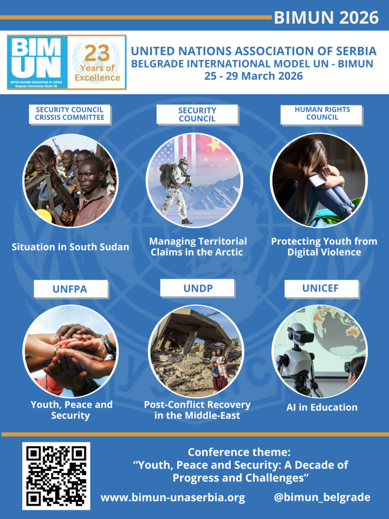 Удружење за Уједињене нације Србије припрема 23. међународну омладинску конференцију „БЕОГРАДСКИ МЕЂУНАРОДНИ МОДЕЛ УЈЕДИЊЕНИХ НАЦИЈА – БИМУН 2026”, која ће се одржати у Београду од 25. до 29. марта 2026. године.