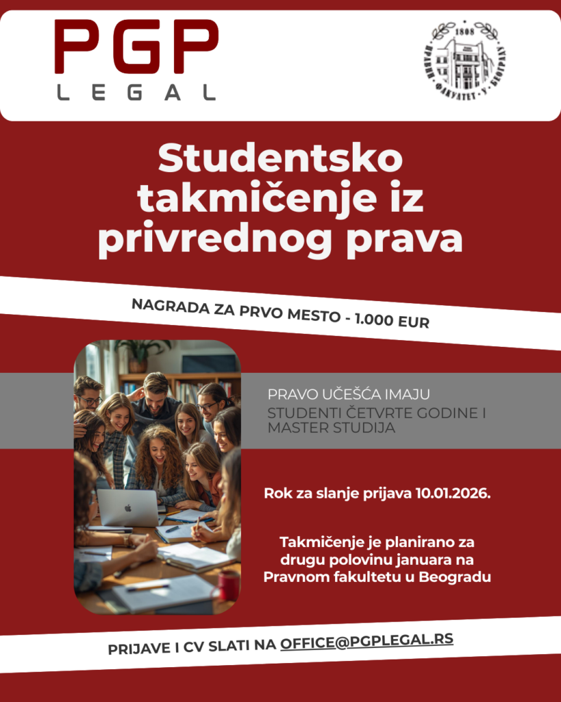 Пријава: Кандидати се могу пријавити слањем биографије (CV) и контакт података на адресу office@pgplegal.rs најкасније до 10. јануара 2026. године.